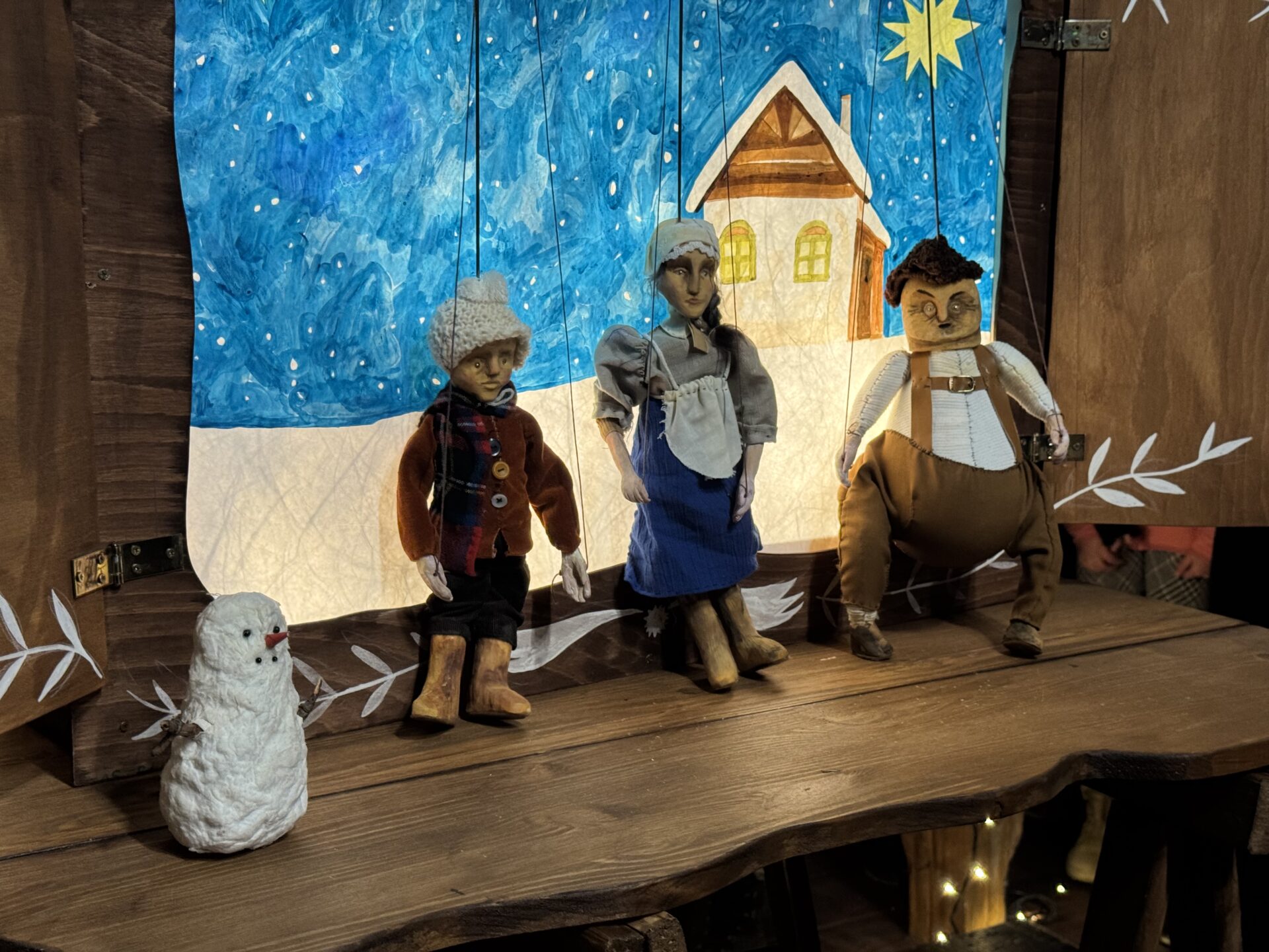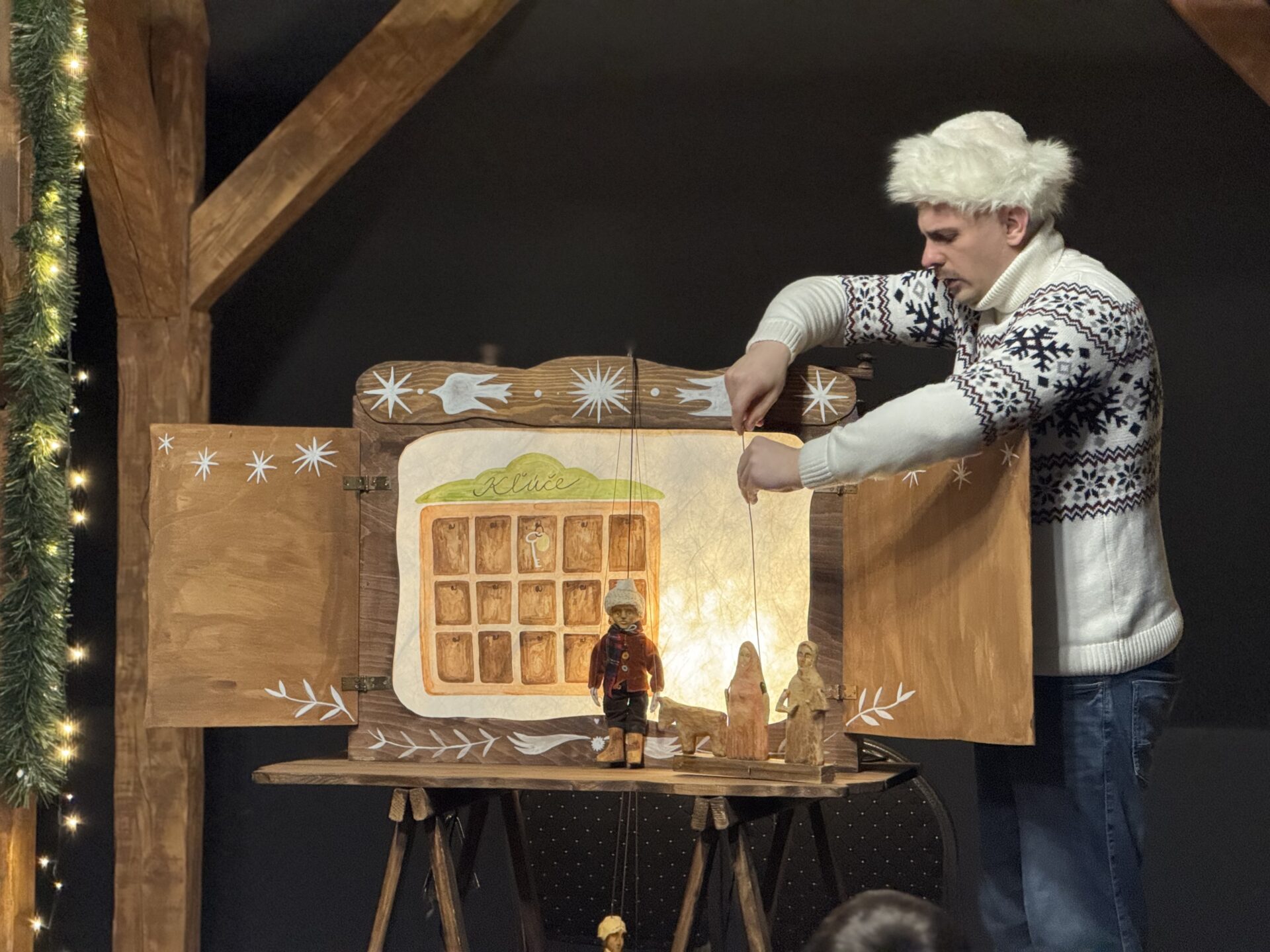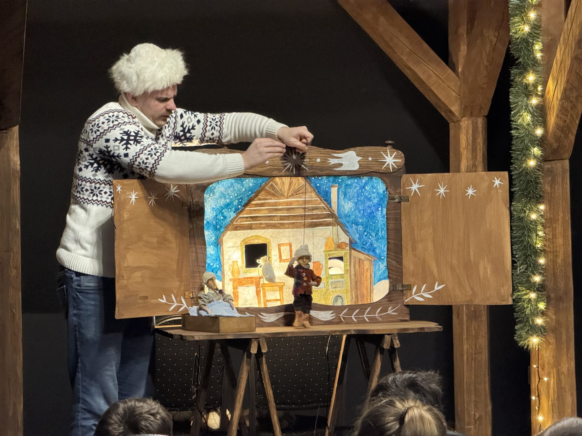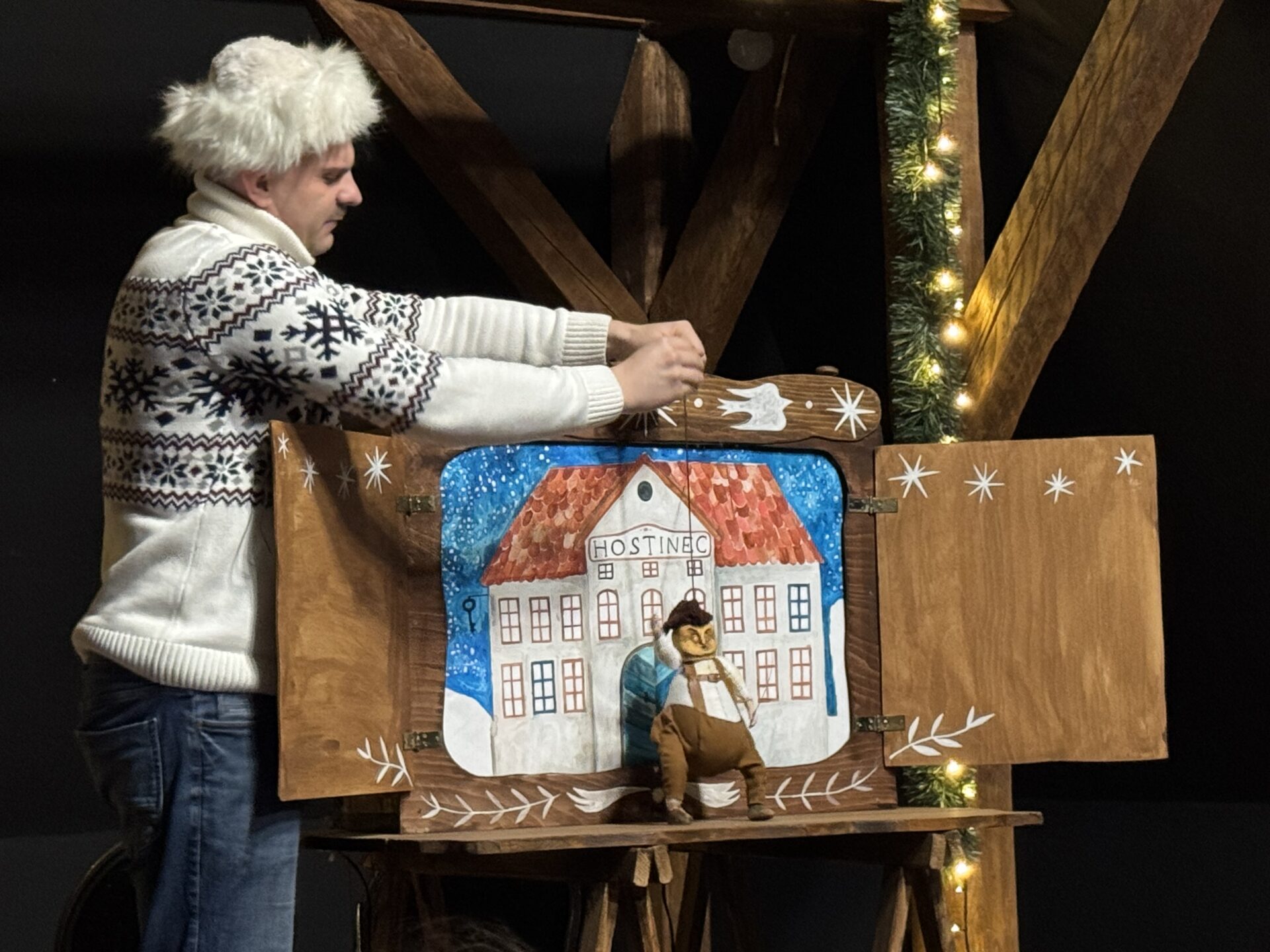 Malí diváci sa ocitli v čarovnej atmosfére, kde uvideli originálny príbeh rozprávaný prostredníctvom „crankie“ škatuľky, fungujúcej ako ozajstný filmový pás. To všetko v spoločnosti drevených bábok a vianočných piesní, ktoré dotvárali výnimočný sviatočný zážitok.