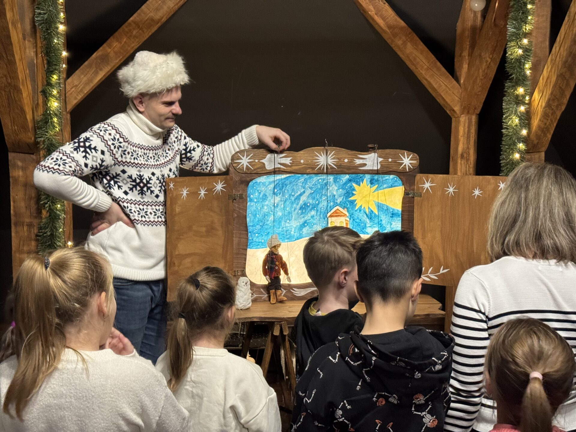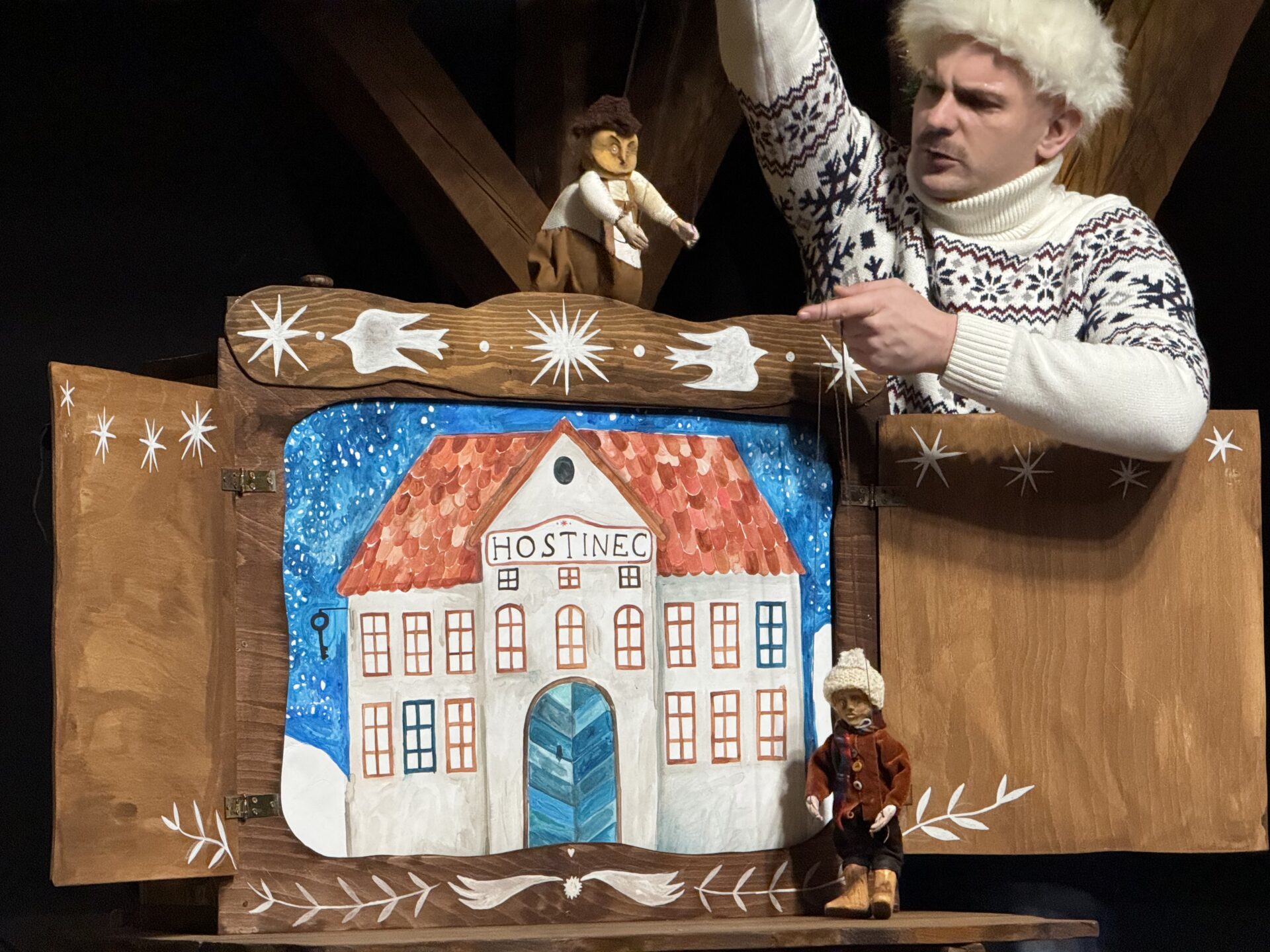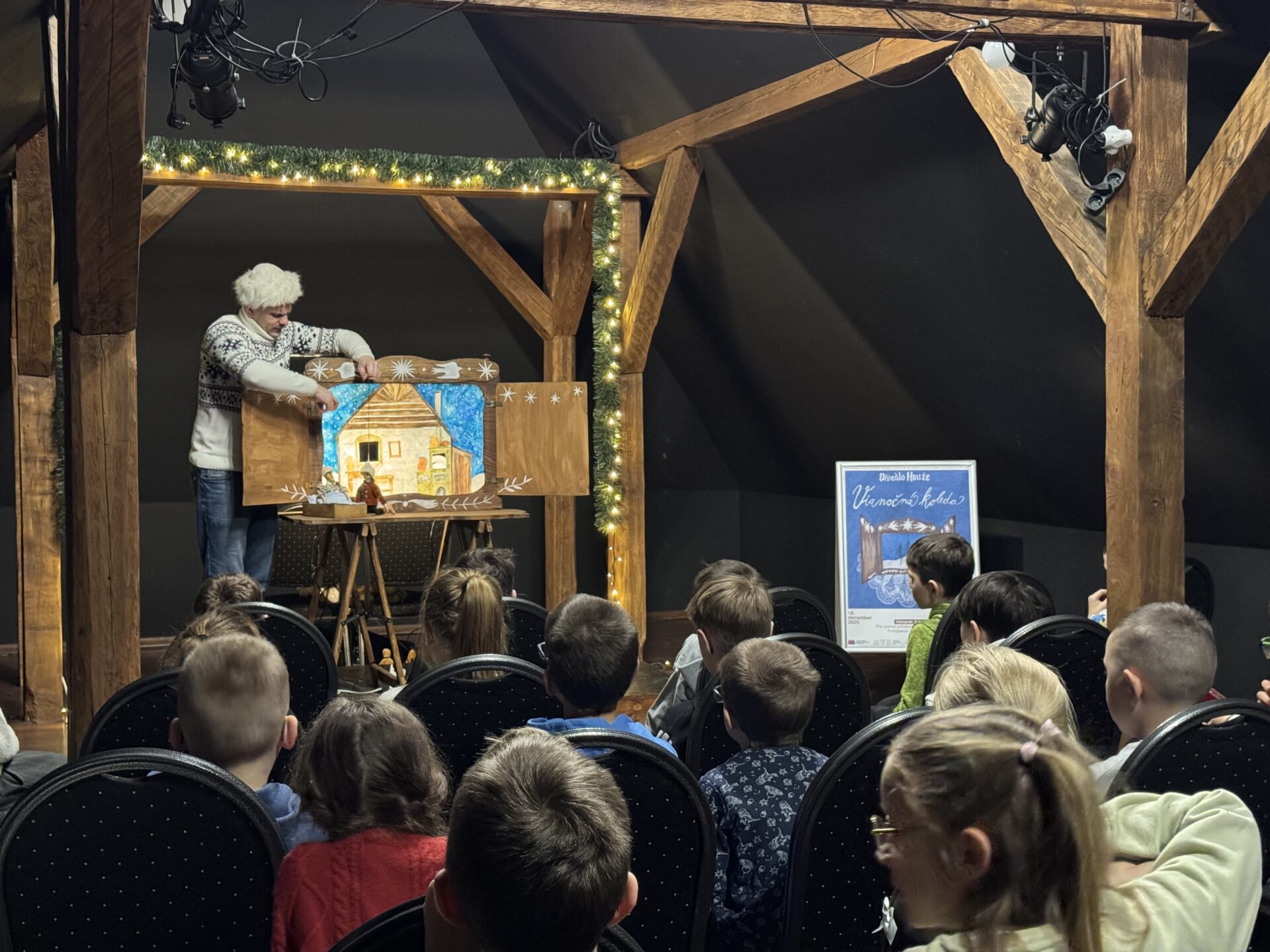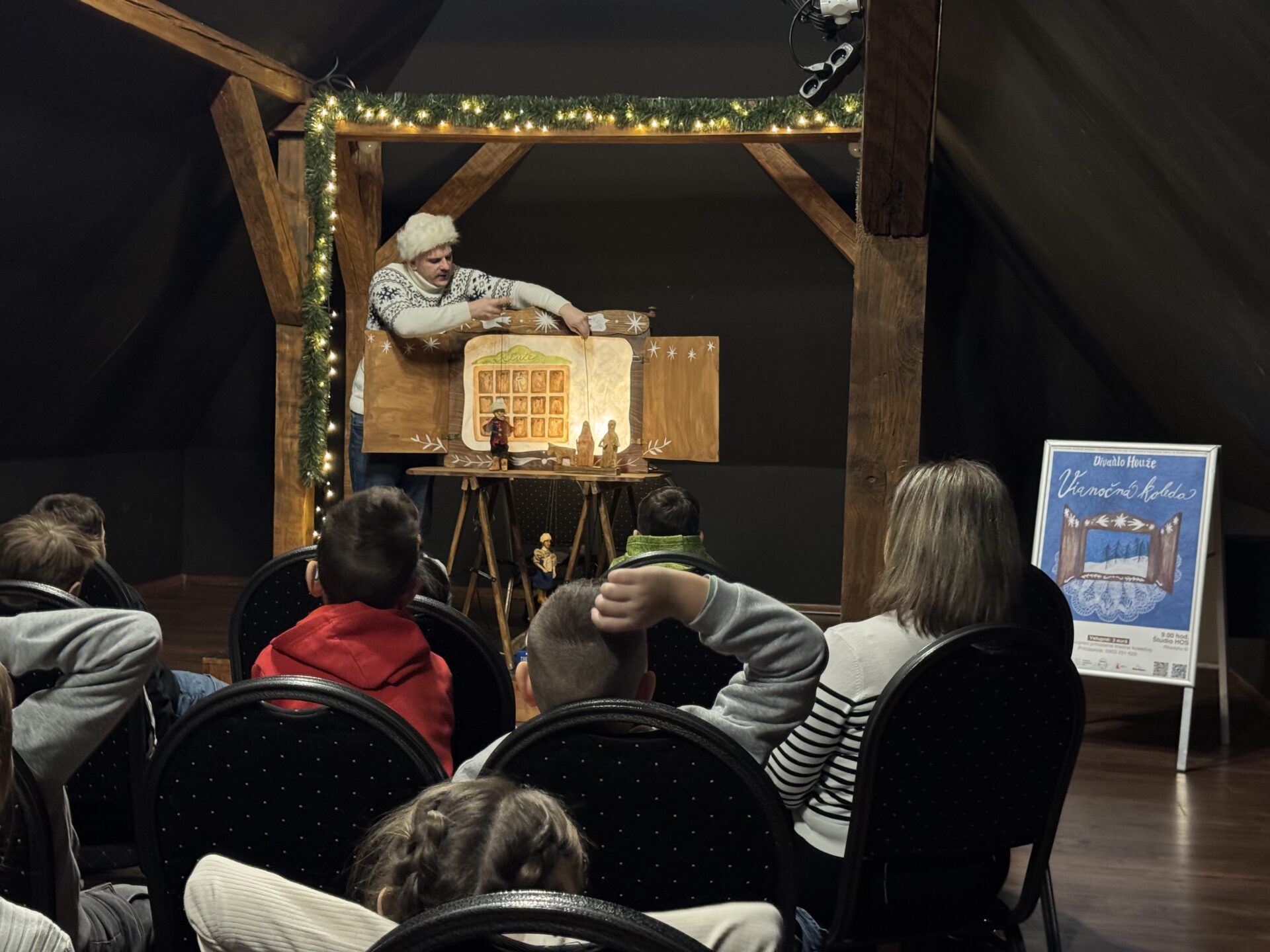 Malí diváci sa ocitli v čarovnej atmosfére, kde uvideli originálny príbeh rozprávaný prostredníctvom „crankie“ škatuľky, fungujúcej ako ozajstný filmový pás. To všetko v spoločnosti drevených bábok a vianočných piesní, ktoré dotvárali výnimočný sviatočný zážitok.