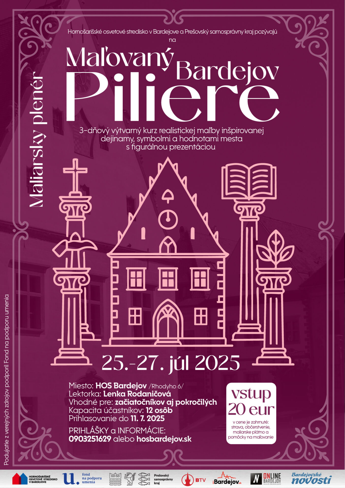 V dňoch 25. – 27. júla 2025 sa na pôde Hornošarišského osvetového strediska v Bardejove uskutočnil tradičný maliarsky plenér Maľovaný Bardejov. Každoročne prináša možnosť pre neprofesionálnych umelcov a začiatočníkov ponoriť sa do tvorby pod vedením skúseného lektora – tentokrát maliarky Lenky Rodaničovej. Témou bol realistický obraz mesta inšpirovaný jeho dejinami, symbolmi a hodnotami, obohatený o figurálnu prezentáciu.